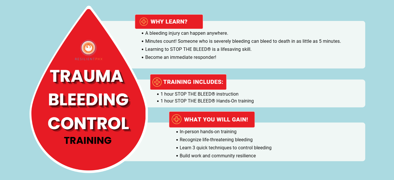 Did you know? The City of Phoenix has in-person trauma bleeding control trainings for all community members. Community members can take advantage of this hands-on training event to learn life-saving skills to immediately respond in emergency situations. Learn how to control bleeding until first responders arrive!