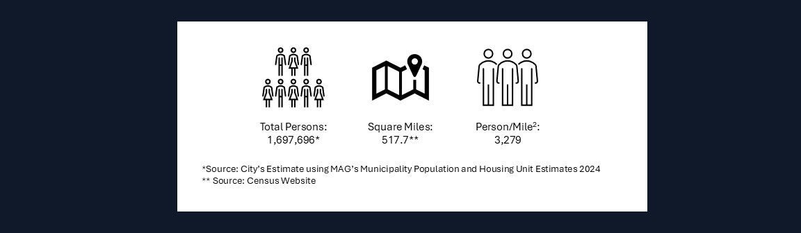 The City of Phoenix is a diverse city with an estimated population of 1.7 million people as of July 2024 and is the fifth largest city in the country. The city’s growth and demographic makeup are always evolving, and Phoenix planners rely on data from the U.S. Census Bureau and other sources to understand the latest trends.