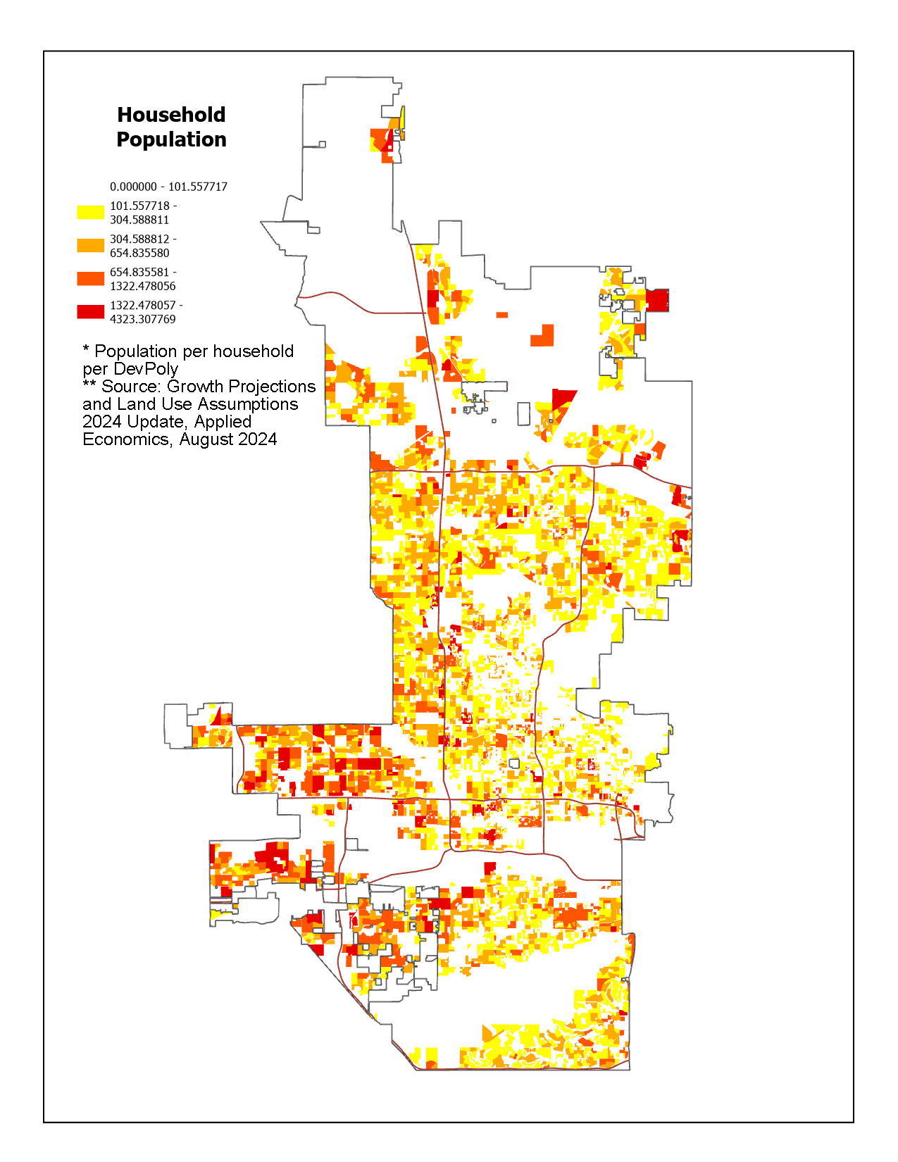 The following maps show the 2026 density of population and employment from the Growth Projections and Land Use Assumptions 2024 Update completed by Applied Economics. Study can be found here: Growth Projections Study 2024.