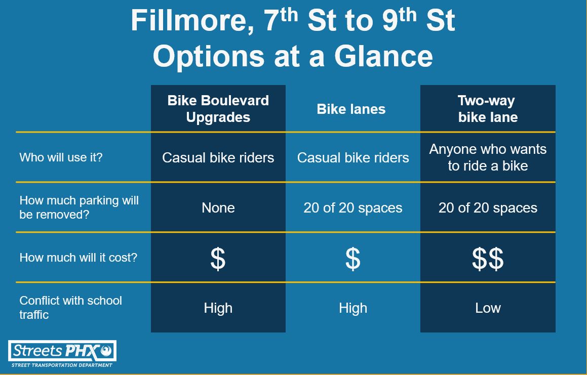 The project has expanded to further create more biking structures in the area, expanding from Van Buren Street to Roosevelt Street. The team has looked at several options, which are viewable below in greater detail. Additionally, another bike project is being proposed along Fillmore Street from Central Avenue to 7th Street.